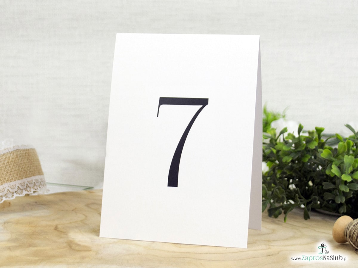 Numer stołu czarny napis na białym tle. Numer samostojący wykonany na papierze 350g.