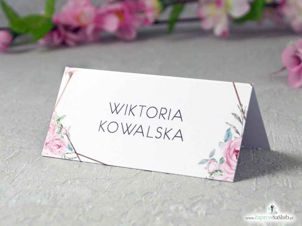Winietki na stół z geometrycznymi liniami i różowymi kwiatami. Winietki są sprawdzonym rozwiązaniem aby sprawnie usadzić gości przy stołach. Winietka została wykonana na papierze o gramaturze 300g. Winietki z geometrycznym wzorem ze złotych linii oraz różowymi kwiatami jest jednym z całej serii dodatków. Całość jest spójna kolorystycznie i tematycznie, przez co spodoba się każdemu ceniącemu sobie estetykę. Pozostałe dodatki mogą Państwo obejrzeć na dole strony. Jeśli nie znaleźliście interesującego Was dodatku, napiszcie do nas – postaramy się go wykonać!
