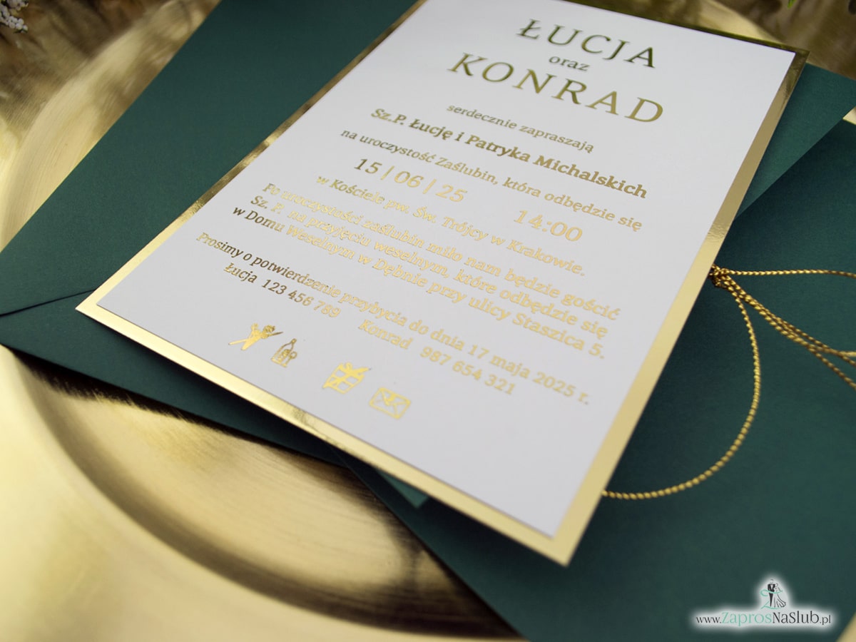 Luksusowe zaproszenie ślubne, które łączy ponadczasową elegancję z nowoczesnym designem. Składa się z głębokiej butelkowozielonej okładki, wewnątrz której znajduje się wkładany element z treścią. Wnętrze wykonane jest z dwóch starannie warstw – błyszczącego złotego papieru oraz klasycznej bieli, na której nadrukowany jest tekst w czarnym kolorze lub w eleganckim złoceniu.