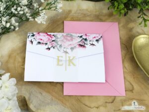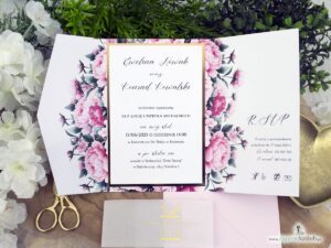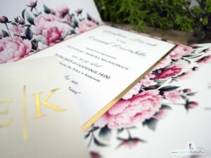 Eleganckie zaproszenie ślubne w formie folderu, ozdobione subtelnymi różowymi piwoniami, to wyjątkowa propozycja dla par ceniących klasyczne piękno i wyrafinowany styl. Wewnątrz zaproszenia znajduje się wklejany złoty papier, który dodaje mu eleganckiego charakteru. Na nim umieszczona jest dodatkowa warstwa białego papieru z treścią, co sprawia, że zaproszenie jest nie tylko efektowne, ale także solidne i elegancko sztywne. Dodatkowo możemy wykonać całą środkową wklejaną część zaproszenie w formie złocenia tekstu.