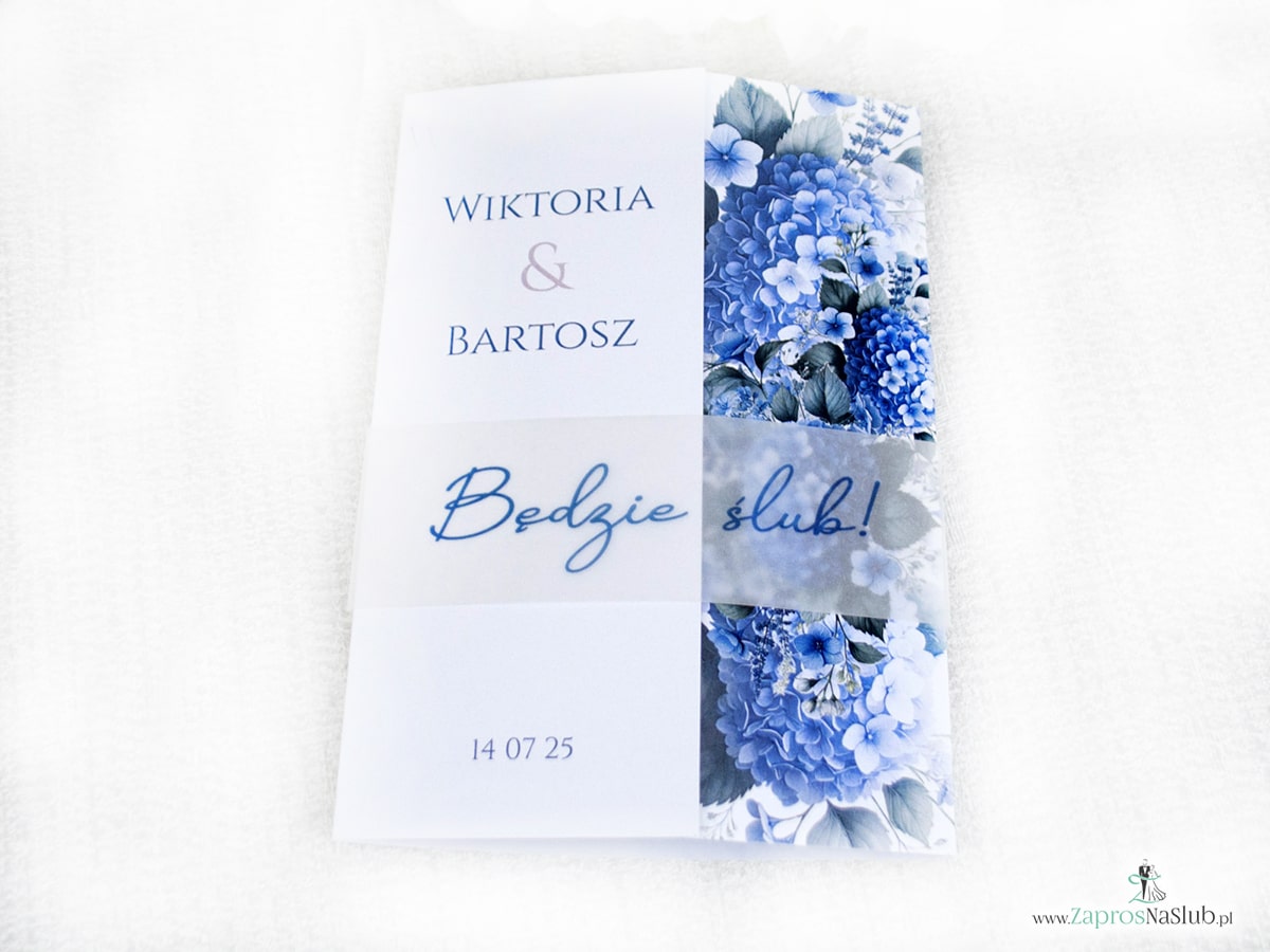 Zaproszenia ślubne w formie folderu z kwiatami hortensji i opaską z kalki z napisem: „Będzie ślub” (możliwość zmiany tekstu na inny, np. data, inicjały, pobieramy się, itp.). Na okładce zaproszenia znajdują się imiona oraz data, które również możemy zmienić na inne dowolne teksty, np. inicjały.