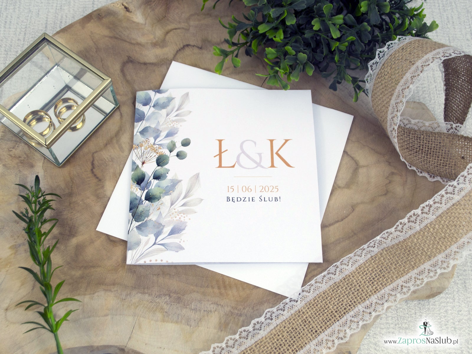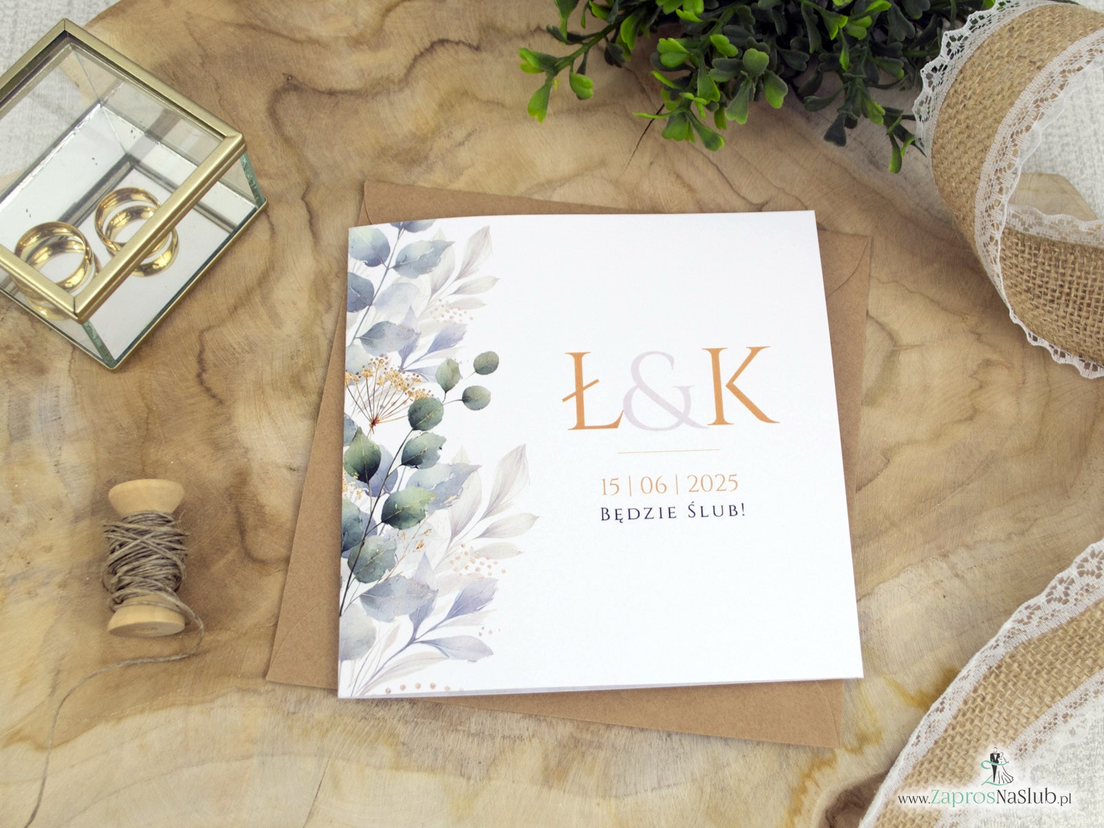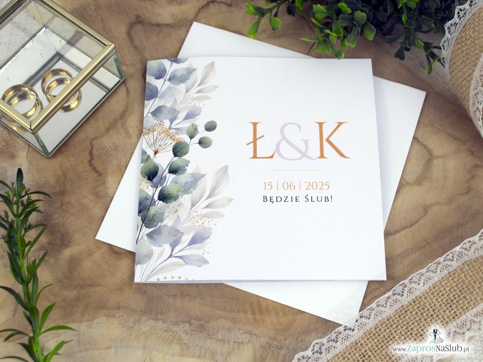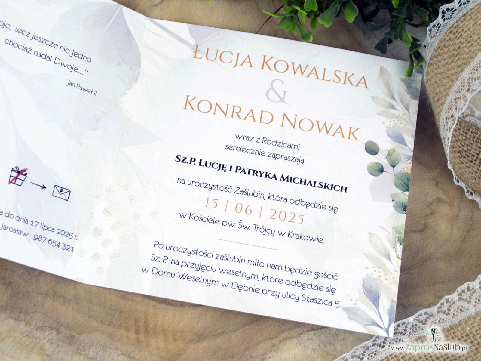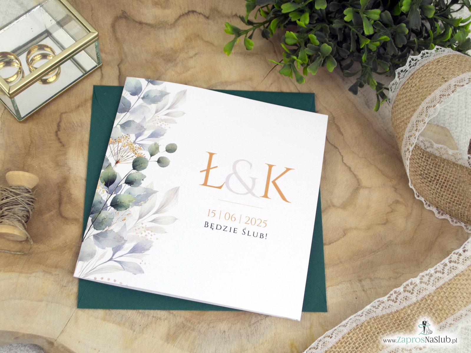 Zaproszenie ślubne z zielonymi listkami i złotymi akcentami. Zaproszenie otwierane na bok z inicjałami na okładce oraz zielonymi liśćmi i delikatnymi złotymi akcentami. Zaproszenie wykonane na grubym eleganckim papierze, który jest bardzo przyjemny w dotyku.
